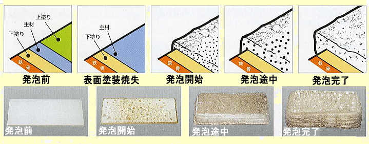 ![]() SKタイカコートの外観は、通常時は一般塗装仕上げと同様です。火災時に熱を受けると、250℃前後で発泡を開始し、20〜30倍に 膨張して炭化層を形成します。その炭化層が断熱層となり、鉄骨の温度上昇を抑えます。。 |