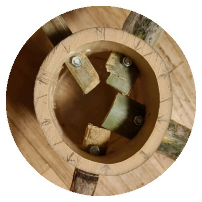 中心部は、丸竹に穴をあけ、割竹を刺して、ジョイントを作りました。