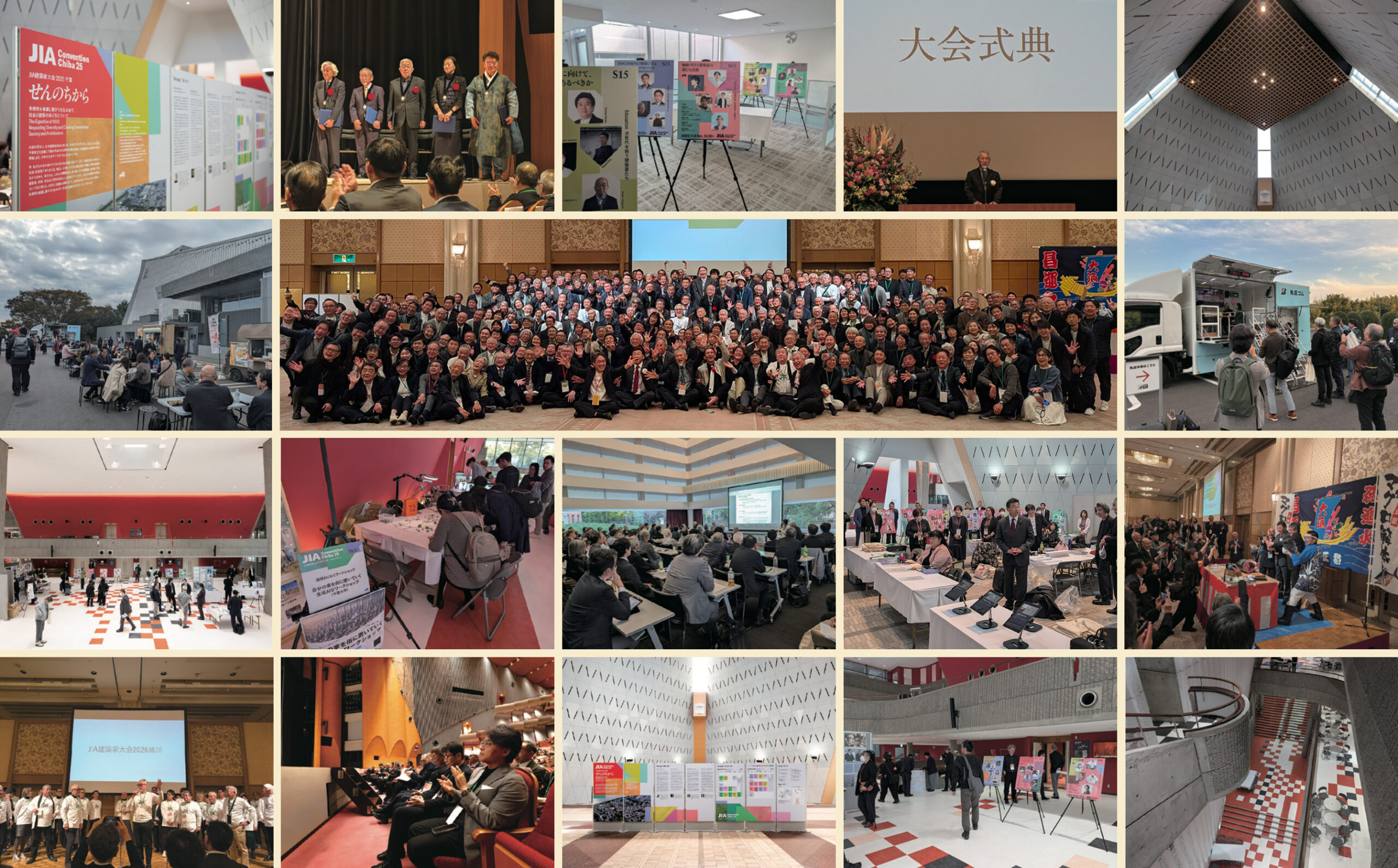 JIA建築家大会2025千葉「せんのちから」は、国内外から多くの参加者の方々にお越しいただき、2025年11月7日(金)、8日(土)の2日間、千葉県文化会館と千葉大学ゐのはな同窓会館を会場に無事開催されました。実行委員会は、開催2年前から数多くの会議や検討を重ね大会準備をしてまいりました。大会申込人数は802名(当日の一般参加者除く)、大会期間(11月7日、8日)のセッション等の累計視聴者数は2,881名を記録し、過去最大級の大会となりました。ご参加いただいた皆様のご協力のおかげです。大変ありがとうございました。