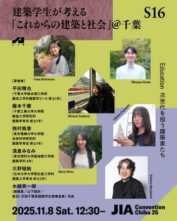 千葉には2022年に日本建築学会教育賞を受賞した「千葉県建築学生賞」や、県内5大学で同じ設計課題に取り組み切磋琢磨する「Cリーグ」といった個性的な教育プログラムがあります。本企画では、千葉で建築を学ぶ建築学生を登壇者に招き、これからの建築と社会の在り方や建築家の職能などについて考えます。