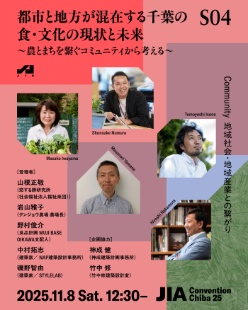 本企画では千葉県内で個性的な事業を展開している施設に着目し、その活動や背景にある理念を紹介。農業関連施設の設計経験をもつ建築家 中村拓志氏にも登壇いただき、食の安全性や健康志向が重視される中での農業の重要性、さらには防災や棚田に代表される耕地によるランドスケープの有効性など、農とまちを繋ぐ未来のまちづくりについて考えます。