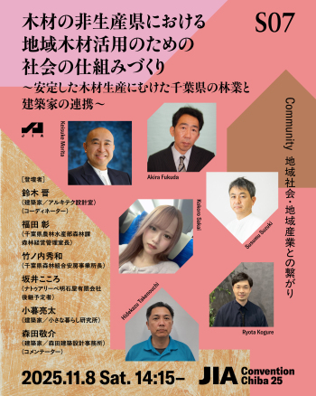 本企画では千葉県森林課をはじめ、山主、森林組合、製材所、林業後継者など、林業に関わるさまざまな立場の方々をお招きし、地域木材活用の実態や課題をお話しいただくとともに、建築家も加わり、県産木材の活用促進に向けた今後のあるべき姿を考えます。