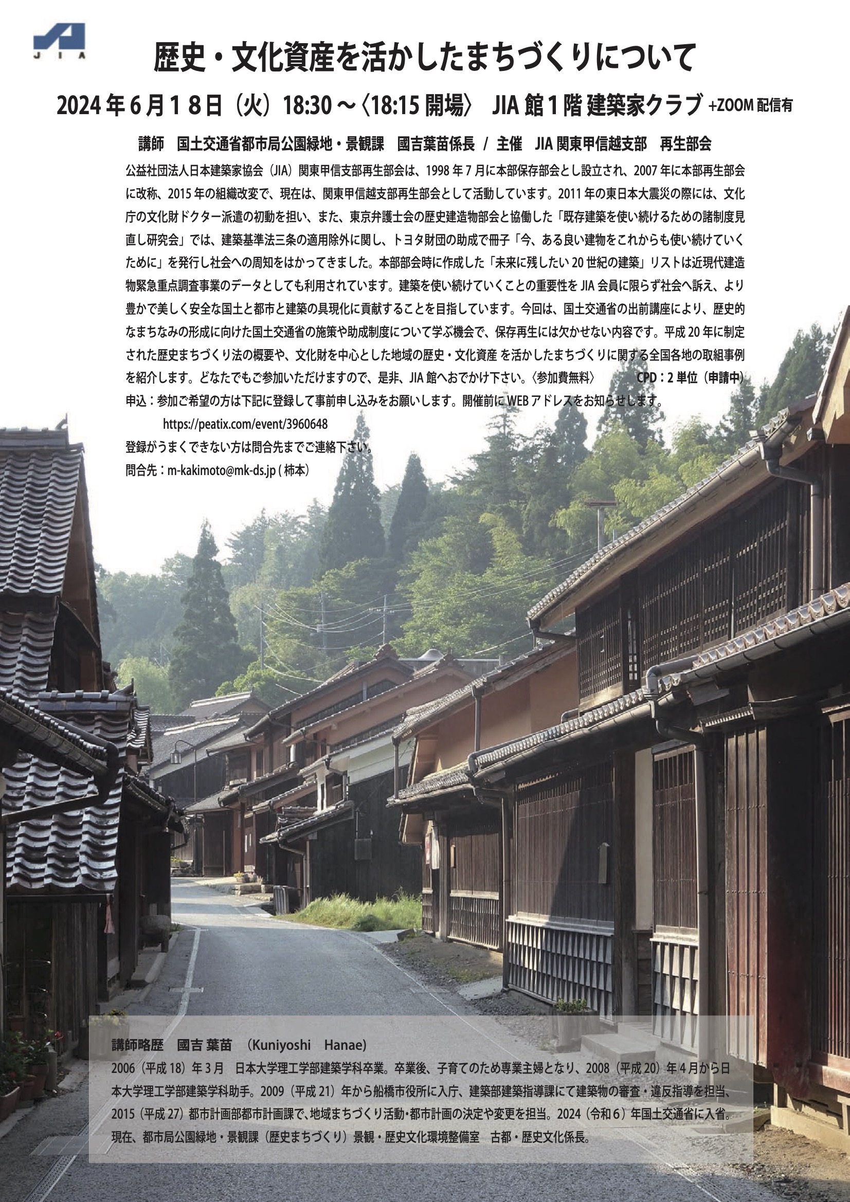歴史的なまちなみの形成に向けた国土交通省の施策や助成制度について学ぶ機会で、保存再生には欠かせない内容です。平成20 年に制定された歴史まちづくり法の概要や、文化財を中心とした地域の歴史・文化資産 を活かしたまちづくりに関する全国各地の取組事例を紹介します。一般の方でもどなたでもご参加いただけます。是非、お申し込み下さい。