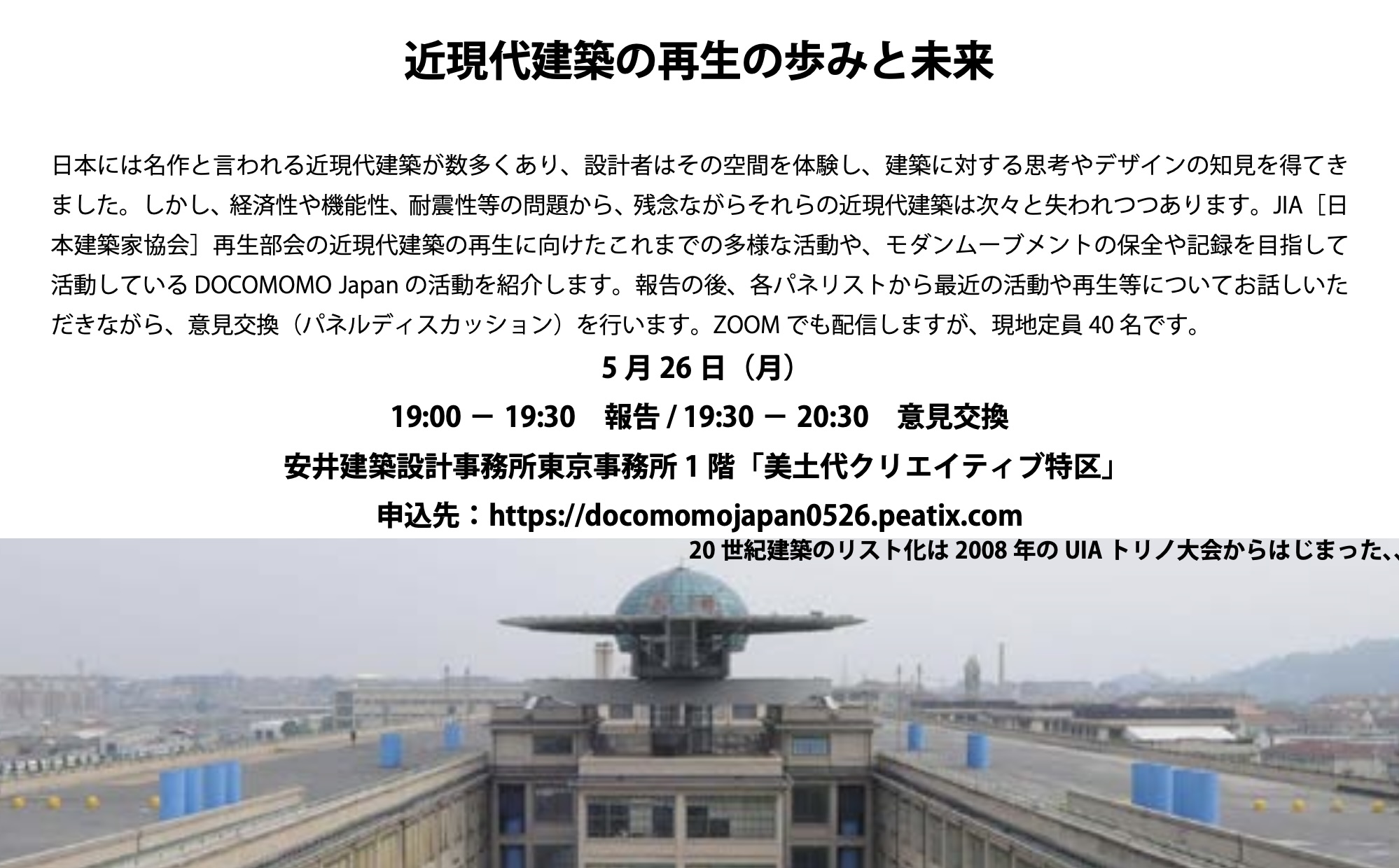日本には名作と言われる近現代建築が数多くあり、設計者はその空間を体験し、建築に対する思考やデザインの知見を得てきました。しかし、経済性や機能性、耐震性等の問題から、残念ながらそれらの近現代建築は次々と失われつつあります。JIA 【日本建築家協会]再生部会の近現代建築の再生に向けたこれまでの多様な活動や、モダンムーブメントの保全や記録を目指して活動しているDOCOMOMO Japan の活動を紹介します。報告の後、各パネリストから最近の活動や再生等についてお話しいただきながら、意見交換(パネルディスカッション)を行います。ZOOMでも配しますが、現地定員40名です